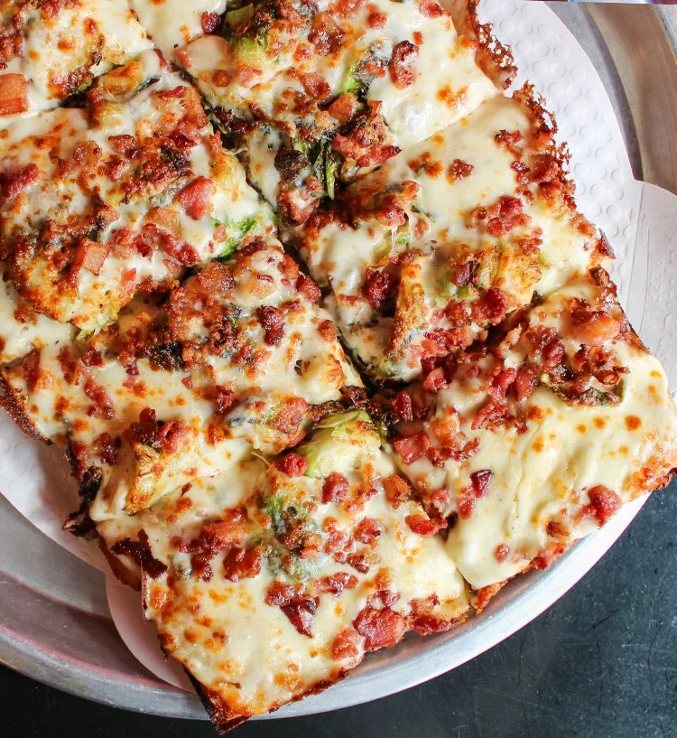 Fried Brussels, Bacon, Garlic White, Mozzarella Cheese, House Seasoning